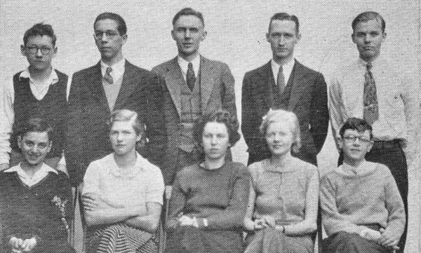Left to Right Front Row: Lionel Nelson, Isobel McIntyre, Louise O'Brien, Eleanor Carson, John Lidstone. Second Row: Ronald Garret, Gordon Dowding, Mr. Jackson, Mr. Stevenson , Norwood Sarles.