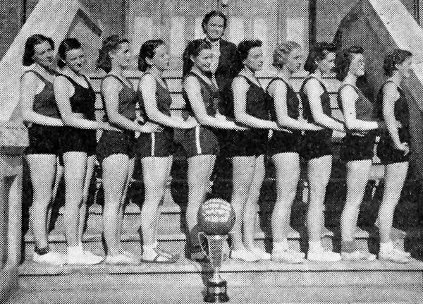 The squad was well balanced; experienced and inexperienced were well moulded in a fast, high-scoring quintette, paced by Betty Hoover and Lucille Wright on the attack, Dorothy Burrows and Kay Boss on the rear guard.