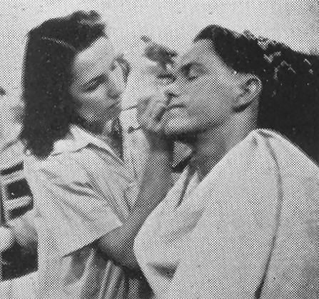 The boys took longer. It seems queer, but they didn’t seem to like the cold cream—said it was too cold! Nor did they like our finished product – bronzed faces with crimson lips and cheeks. Yes, they had rouge and lipstick on. To counteract this, they grabbed the adhesive tape, the crimson and the black lining pencil and proceeded to decorate themselves. “Scars” were popular – tape was even more so. Two boys even sported black eyes – artificial, of course. Hairy chests were penciled in and a “policeman” artist set to work to fill up the vacant spaces.