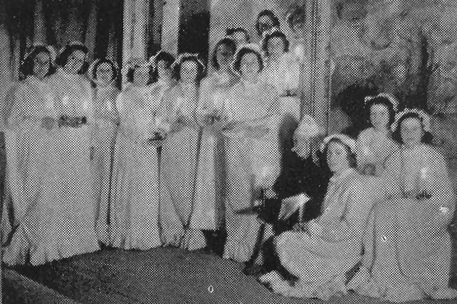 Front row, left to right: Jolly Carson, ?, Peggy Nichol, Jean Archibald, Bessie Slck, Irene Cooper, ?, Dean Fisher, Phyllis Rees, Jane Irwin, Muriel McPherson, Bessie Laroque, Maragaret Moncrieff, Muriel McDiarmid, Margaret McDonald