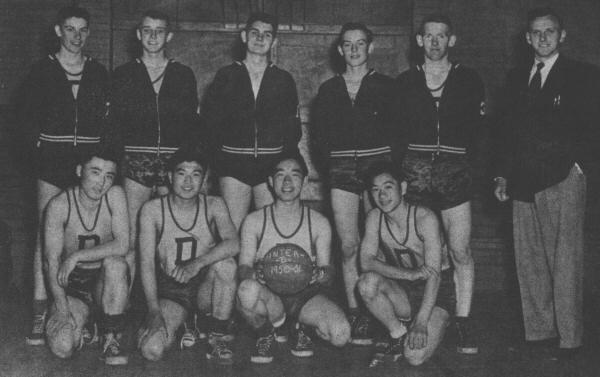 Jack Fowles and Sadao Kodama from last year's Inter "B", who provided the scoring punch and the leadership of the team; Jim Holt, free shot artist; Bob Gale, who doesn't know whetehr to make basketball or singing his career; Henry Wakabayashi, who tried hard as the others did to put the ball into the net; Richard Oikawa, speedy forward; and Barry McIntosh who we think should take his running shoes with him when playing out of town. Our new-comers from out of town are: Ken Yingling, red-headed centre from Blue River; rough and tough Roy Yasui from New Denver.