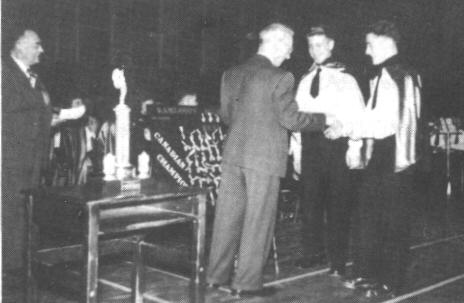 On the 28th of June, 1952, in the beautiful city of Waterloo, the Kamloops High School band added another laurel to its crown. This laurel was the greatest yet, for it was a dominion championship. The band received 87 marks for their playing. The Ontario band which came second received 83 1/2 marks. This certainty was an afternoon. It was 92 degrees and the tension didn't help solve the problem of the heat.