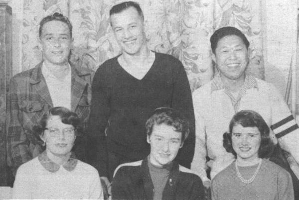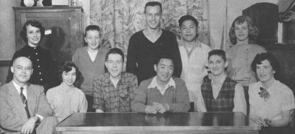 Front row, left to right: Mrs. Elder, Ann Atamanchuck, Gail Martin, John Williams, Donna Morse, Stoni Oishi. Back row: Nori Goto, Grace Watanabe, Pete Elder, Gulchern Singh, Ron Jones, Dale Fidick.