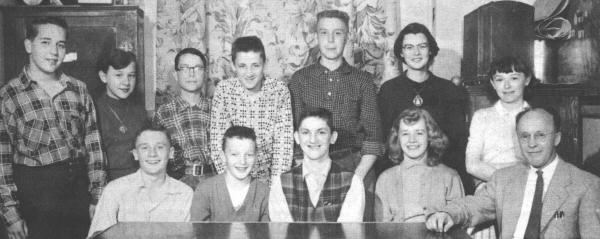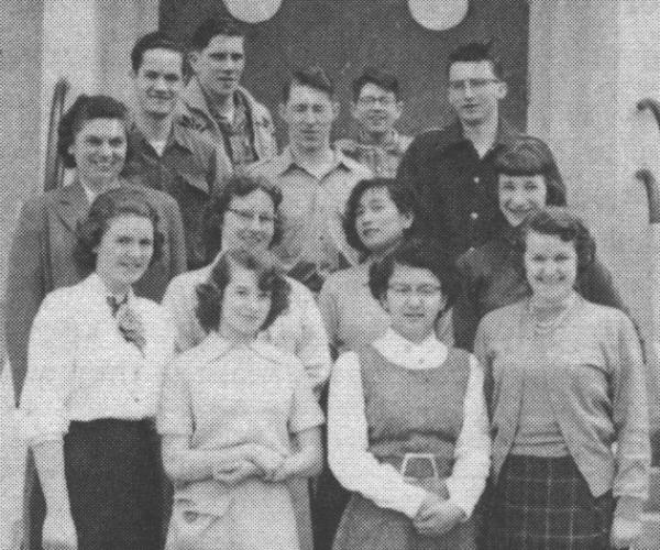 Front row, left to right: Jim Freathy, Mac Jardine, Joe Slater, Elaine Jeffery, Mr. Morse. Back row: Allan Blair, Shirley Kuzyk, David Pearson, Don Schollen, Gerry Cook, Pat Gould, Wendy Patterson.
