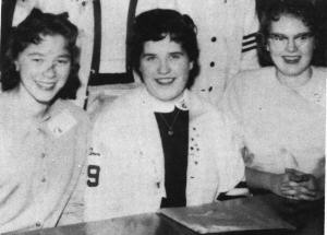 Our Senior teams surged forth to victory this year under the very adequate cheerleading from our Senior Cheerleaders. As well as inspiring the teams, their unique and colorful cheers entertained the crowds. The Senior Cheerleaders cheered at the majority of the home games and also travelled with the teams to Salmon Arm, Vernon, and Penticton. With financial assistance from our ACC the girls were able to buy new uniforms which consisted of black sweaters and red princess lined jumpers. Our thanks for these Senior girls who so ably assisted in making this sports year a success. The 58-59 Senior Cheerleaders are Judy Nicholson, Judy Colquhoun and Sheila Colquhoun.