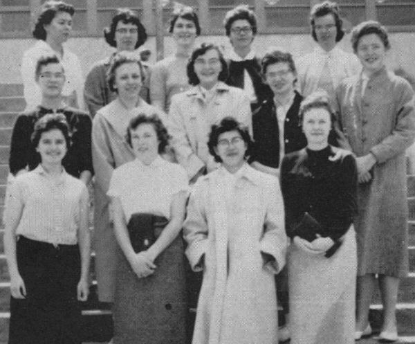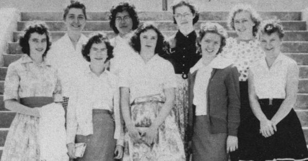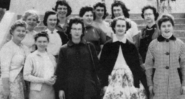 Row one, Left to Right: Helen Walker" Mary Ellen Gamble, Mary Nelson, Adelle Radcliffe, Beulah Phillip. Row two: Miriam Parkes, Joan Turner, Carol Waugh, Lauvel Dawe. Row three: Cecelia Frolek, Joan Dalgleish.