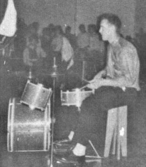 The "Silver Strings" performed at a show at John Peterson during noon-hour. Here Charlie Cook gives the kids a round on the drums.
