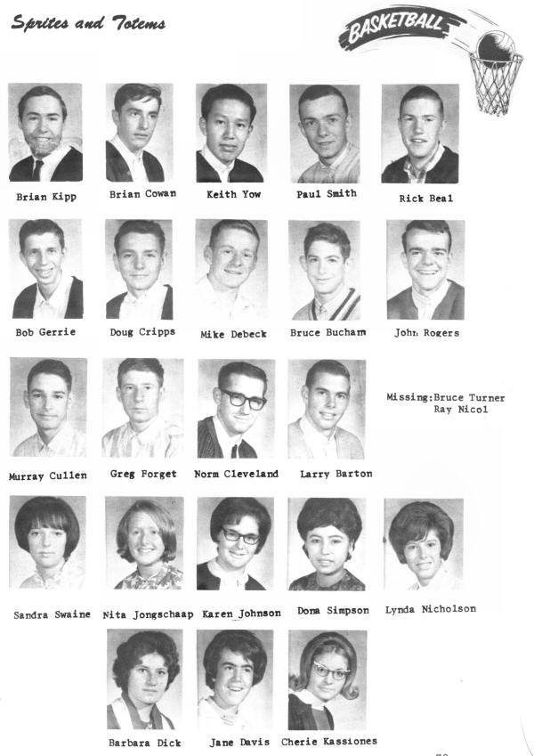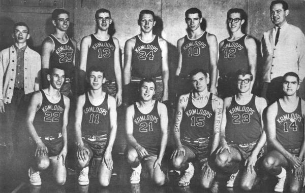 This year the Devils achieved one of the best records ever. Throughout the year they remained undefeated in league play and won every tournament they entered. These included their own Christmas Tournament, the Vernon Tournament, and the Totem Tourney in Penticton. They lost only one game to a high school team, a squeaker to Oroville, Wash. Many of the players gained recognition also, Dave Murphy, Bob Hearn, Randy Murphy, and Dave Marshall all receiving All-Star trophies at various tournaments. In addition, Bob Hearn and Dave Murphy both gained Most Valuable Player awards, Hearn at the Kamloops and Vernon tourneys and "Big Murph" at the Okanagan Finals.