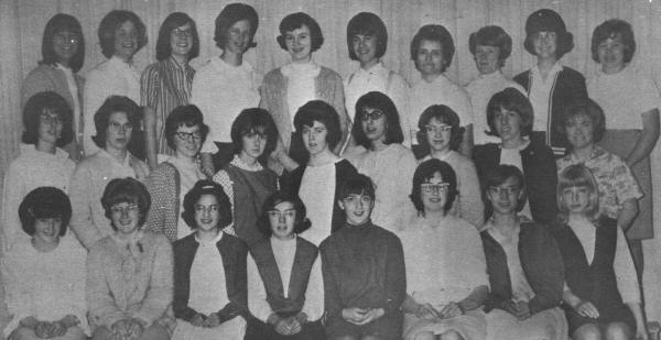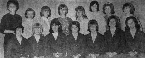 Left to Right FIRST ROW: Valerie Moffat, Joanne Kipp, Mary Thomson, Carolyn Kassiones, Judy Johnson, Noreen Marshall, Gail Stevens SECOND ROW: Miss Minette, coach, Tana Clark, Lynda Jean Nicolson, Lorrie Wilson, Karen Barger, Sharon McHale, Cherie Kassiones, Susan Harvey