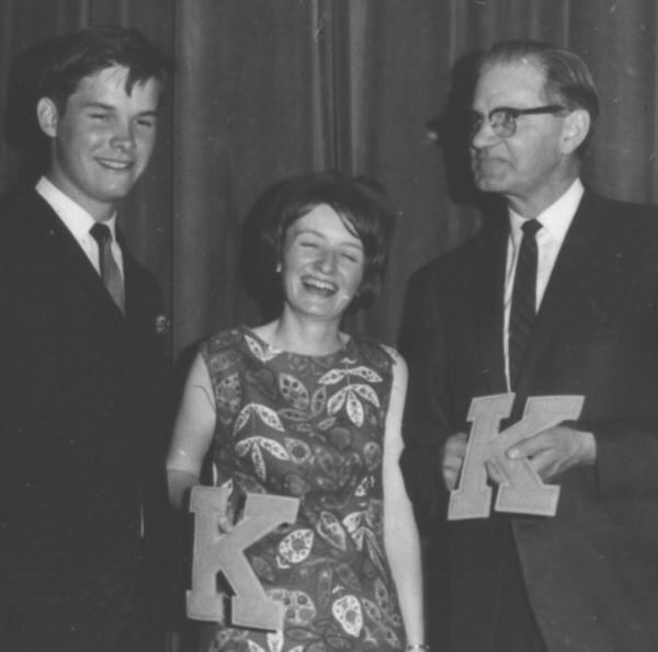 Maureen Marshall and Mr McWannel receive Gold K awards from next year's Student's Council president Brian Long during the June award ceremony. The Gold K is the highest award given by the KSS Student Council.