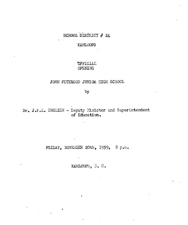 John Peterson was born in Holland in 1825. He came to British Columbia in l862 and established himself with headquarters at Kamloops as a packer of supplies for the Cariboo and Thompson Valley. In 1868 he pre-empted 320 acres and purchased another 320 acres of what is now the present townsite of' the City of Kamloops. At one time he owned all the property east of lst Ave. and south of Lorne Street within the present City limits. In 1885 be sold his ranch to the syndicate or Ward Mara and Pooley for a townsite. He then established himself on a ranch between the present City and Jacko Lake where be lived until he was over eighty years or age. He was first to apply the name Kamloops generally to the area now occupied by the City. As the original pre-emptor of the townsite of Kamloops, John Peterson’s contribution to the early history of the area should be remembered. and it for this reason that the School was named for him.