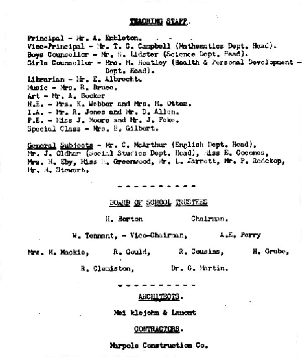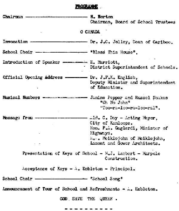 The first Junior High of this district has been built on the southern slope of the hills overlooking the city and the entrance to the North Thompson Valley. This newly completed building is a source of pride to the community as it combines the latest in school architecture with the latest in facilities. The building with its reduced window space has been laid out into four areas: the teaching block, the shops and cafeteria, the combined auditorium and gymnasium with the attached combined shower and washroom facilities and the administrative block. Adequate p1aying grounds and a large playing area are located at the rear of the school.